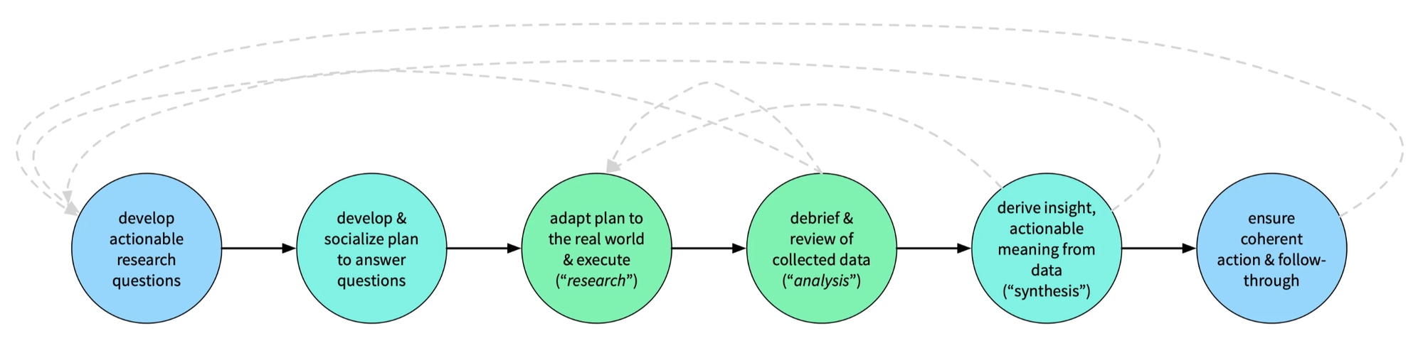 Some of our teams are stuck in the "old world" where researchers are dropped in like a pure service provider: take an input, do some work, produce an output. And then they disappear. Projects without a feedback loop for updating and incorporating new evidence into shared understanding and direction beg the need for short-cycle insights and integration.
