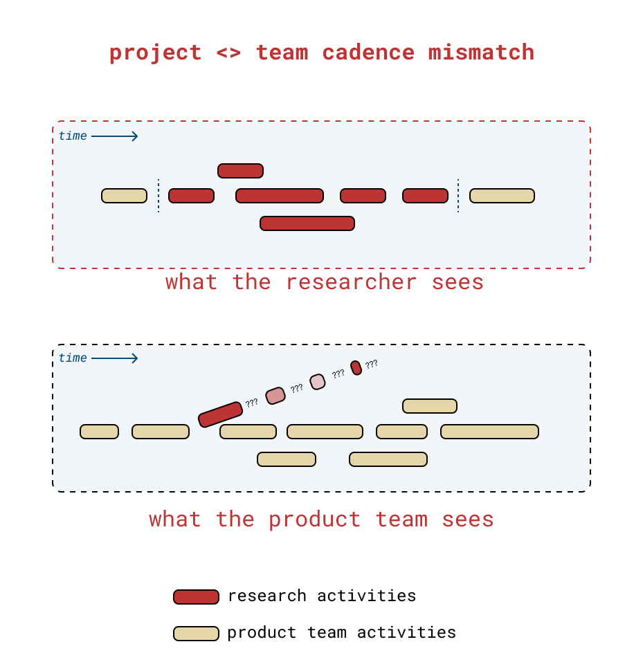 When research is tightly bundled and self-contained, it can become a black box to a team whose reality is moving at a different speed. Cadence mismatch, shown in Figure 4, is a recipe for disillusioned researchers, annoyed product teams, and general misalignment.