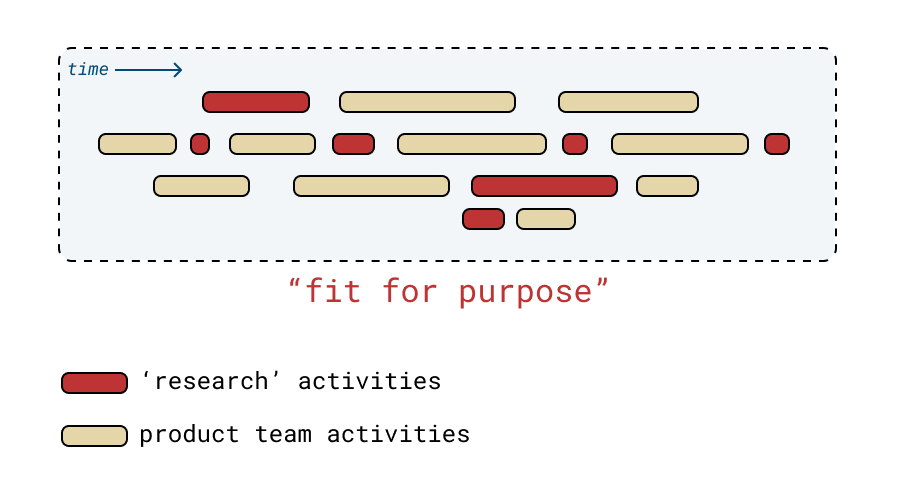 But research-led projects are not always the right tool for the job. Like any method or tool, it has to fit its context of use. There is a dogmatic danger in fighting for this project-bound, "researchers own the researching" mode, without respect for the larger reality of the software development context.