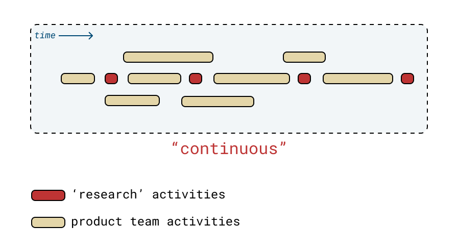 In the absence of time or support, other teams have latched on to the idea of "all-continuous all-the-time" where everything must be answered in cadenced user interviews or small-cycle experiments. If it can't, it won't be addressed. Lack of time for depth spurs the eventual need for long-cycle insights and space that the regular crush of product activities does not afford.