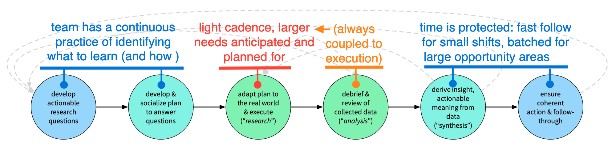 A hallmark of this learning mode is building contextual awareness in a way that's designed to first fit into the product team's work cycles. That means, primarily, weekly customer conversations.
