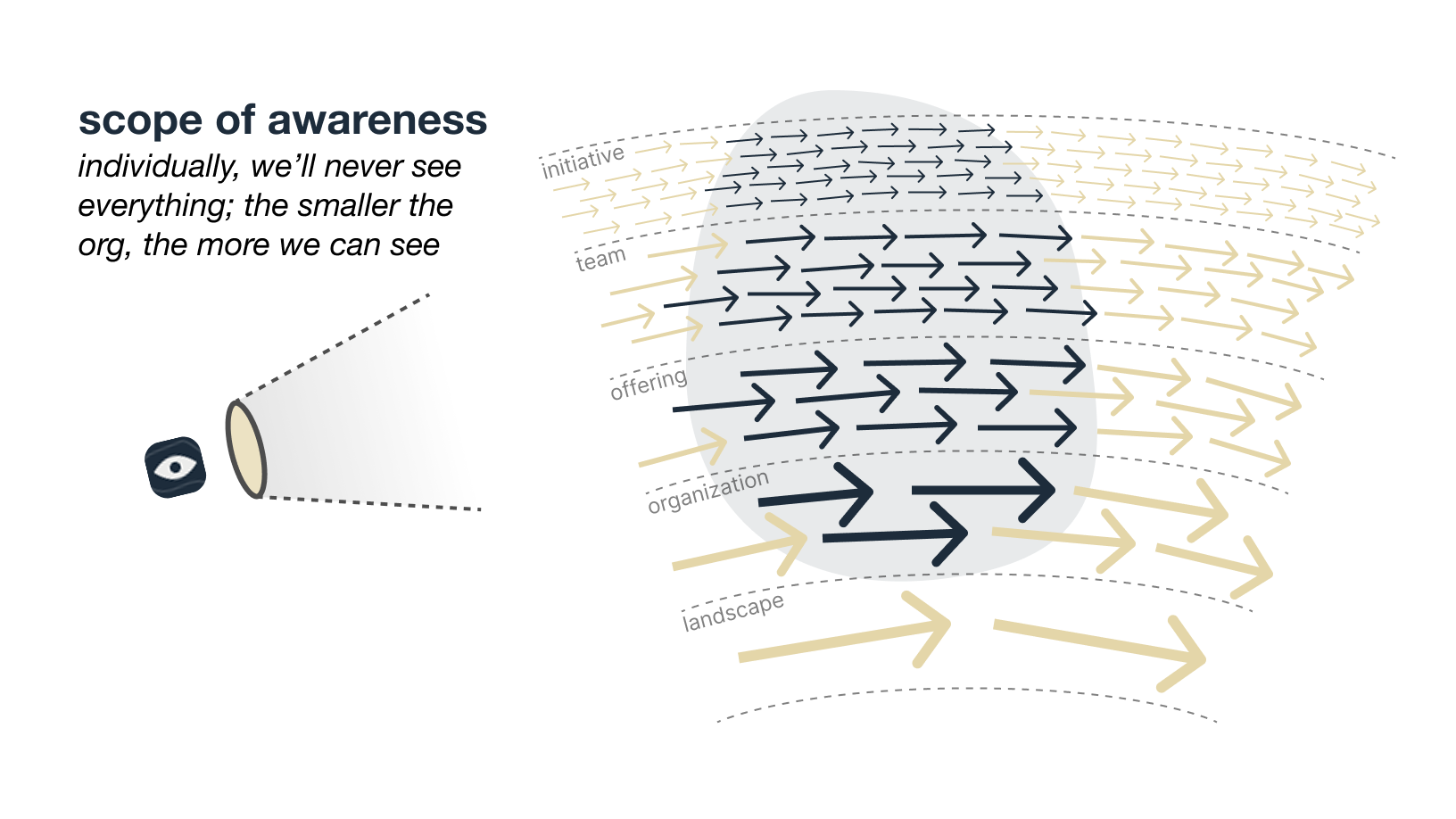 We as an individual will never carry a working vision of the whole structure and the dynamics that operate in and around it. (Even as a one person enterprise, I'd argue, it's not possible to get a handle on the whole thing.)