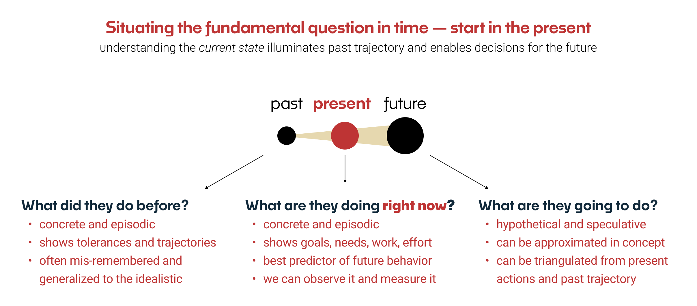 The fundamental research question is "what are they doing right now?" The 'right now' is crucial for informing decisions that depend on if, and how, those changes in behavior will happen. Product work is constantly looking to create state changes, not hypothetical futures in the formless void, and we can only talk about the 'to' if we understand the 'from.' In our work, the 'from' is always whatever is happening right now.