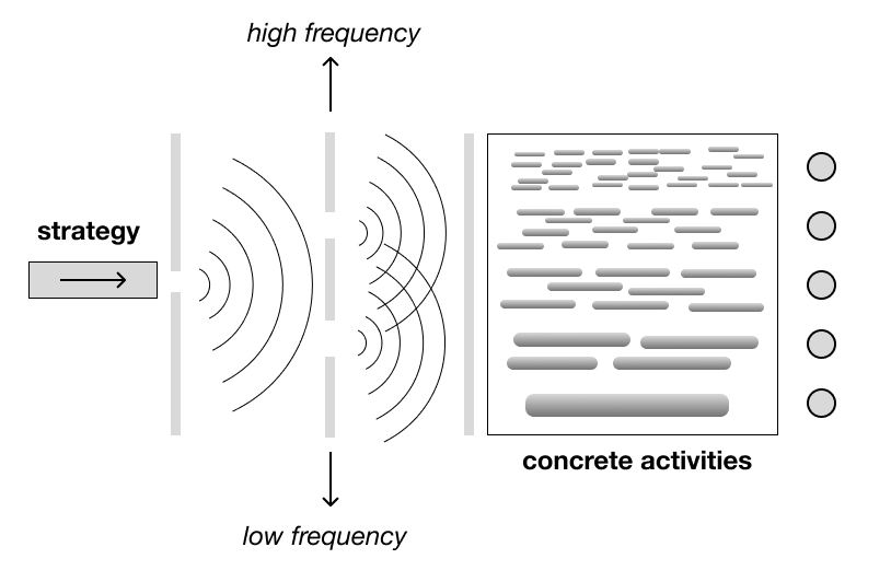 Effective strategy is inseparable from quality work at each level of scale. And it's concrete. It lives in how we shape our work, the models we make, interactions between individuals, the infrastructures we support, patterns of communication, descriptions of goals and targets, among many more visible structures and activities.