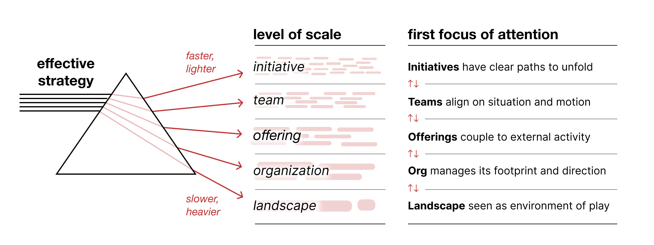 Strategic concern lives at every level of scale. With a guiding metaphor — splitting the light of strategy through a prism of speed and momentum — we can see five levels of scale, each with different means and modes of work.