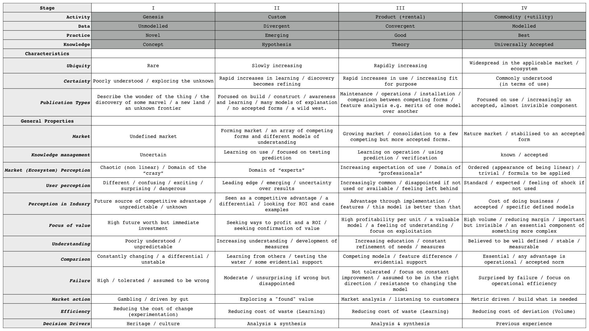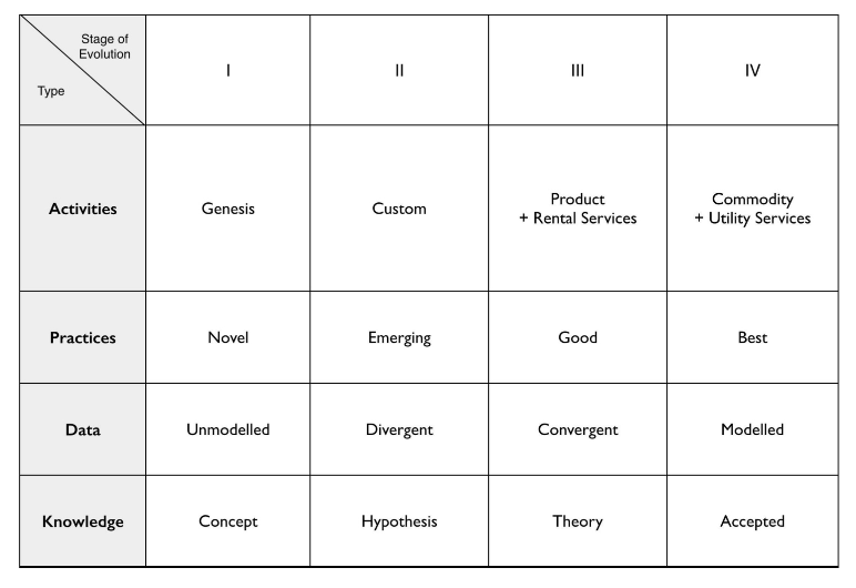 Everything evolves through the same kind of path of novel wonder to commodity competition. We can identify four stages along this trajectory. Each stage presents different characteristics and requires different methods to understand and manage components. - Context-specific Maps