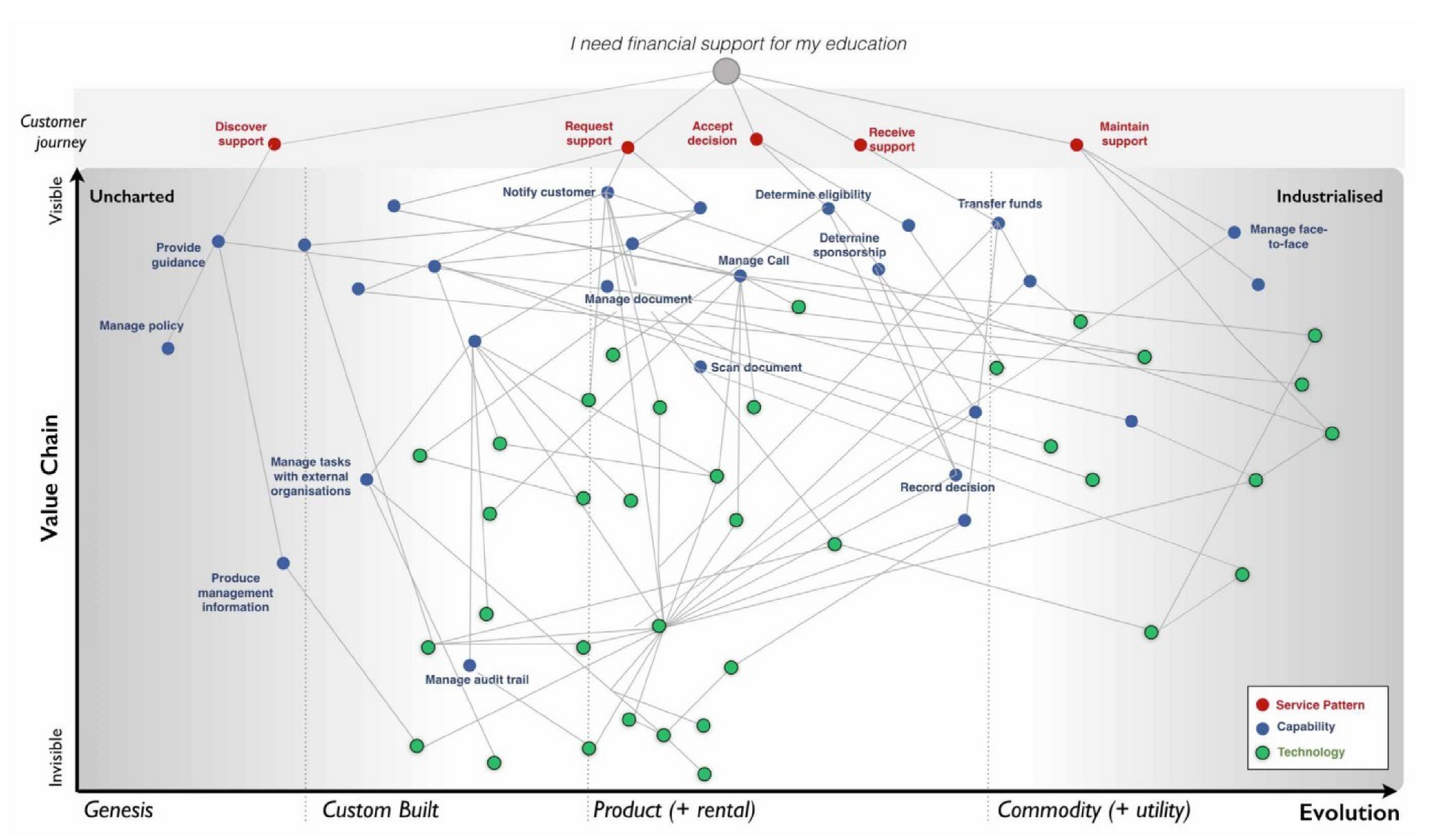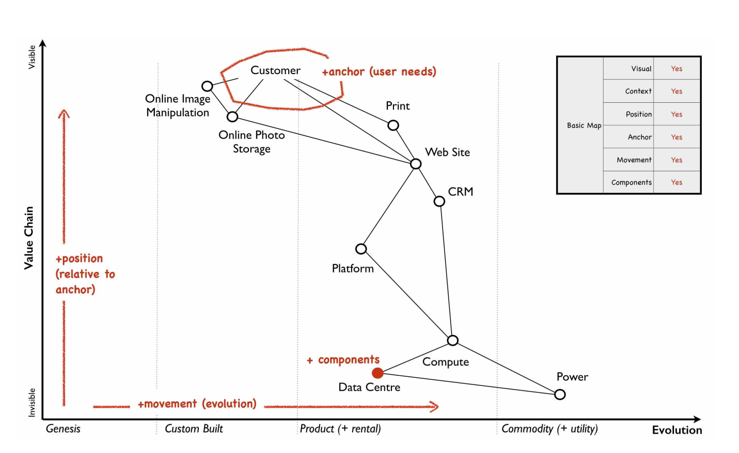 The most important thing about a Wardley map is that it's visual: a gameboard that lets us see the pieces in strategic play. Each piece is a value chain component, flowing down from an anchor of user need, with an evolutionary position along the map's x-axis. - Climatic Patterns