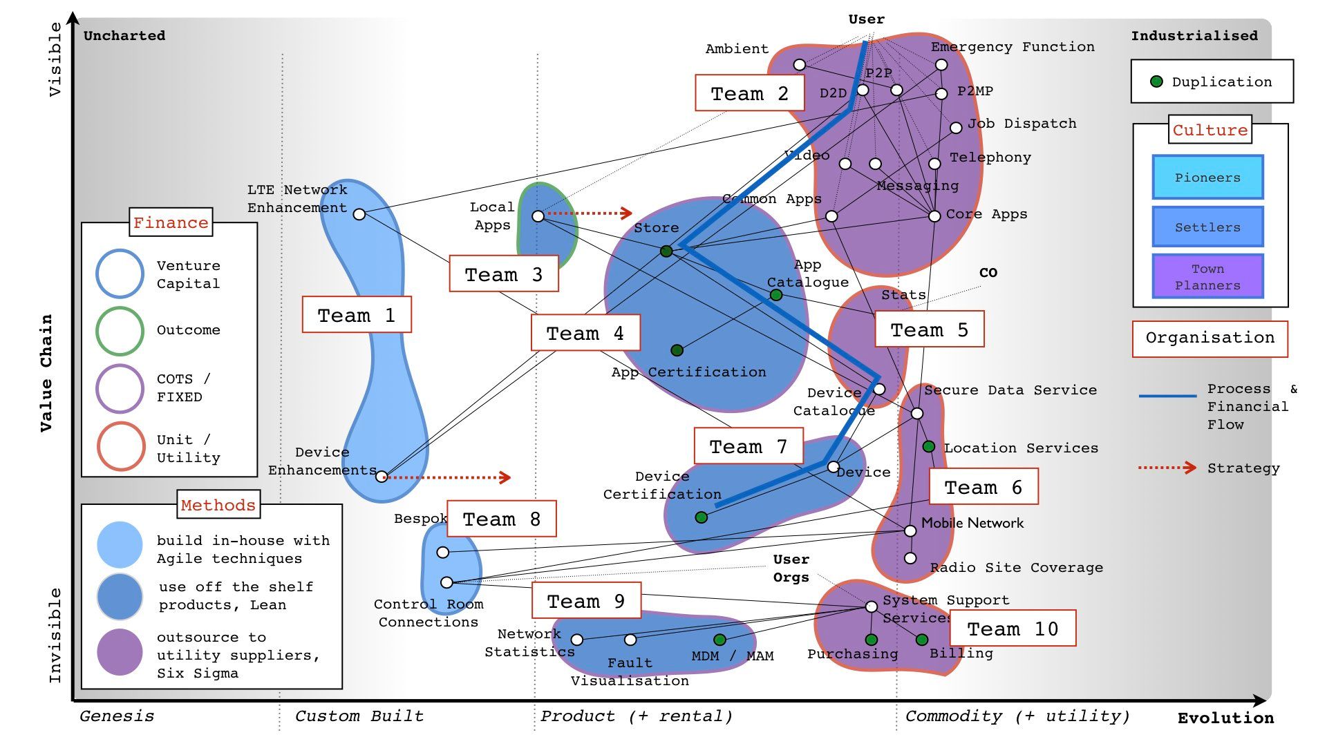 This map is a truly flexible gameboard. Evolution has implications for aspects of organizational composition, financial management, operational models, and organizational culture. Strategic investments, motion, and flows of value can be clearly shown.