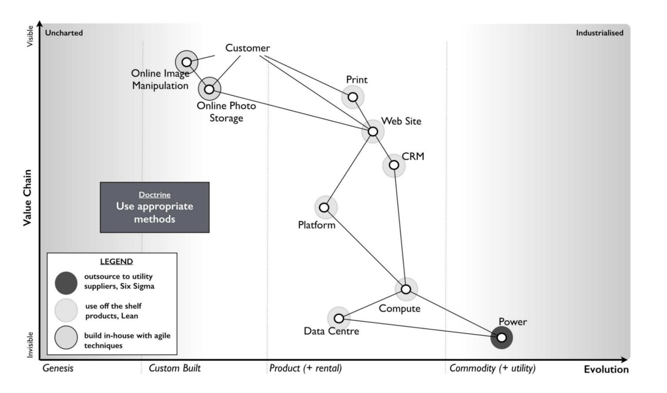 Doing the work of strategy well requires making visible and discussable that which was felt but was previously invisible. (We need to show the schwerpunkt.) Wardley Maps push us to break our business and our market space down into discrete value chains, building situational awareness — and strategy — according to the evolutionary state of each component. Here are a few examples: