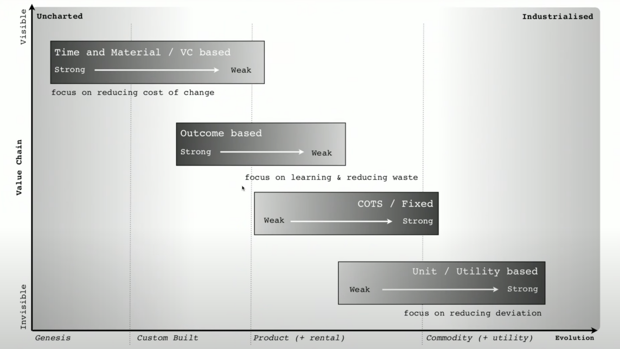 Each stage helps us understand how to manage, fund, and explore value for a given component. Attempting to build a commodity component in-house, creating or maintaining our own data centers, for example, makes sense when we're working a high-volume platform play; the opportunity cost is recklessly high if the value we intend to capture lies in higher-order capabilities like anomaly detection over massive datasets, recommendation engines, or new best practices for design and development.