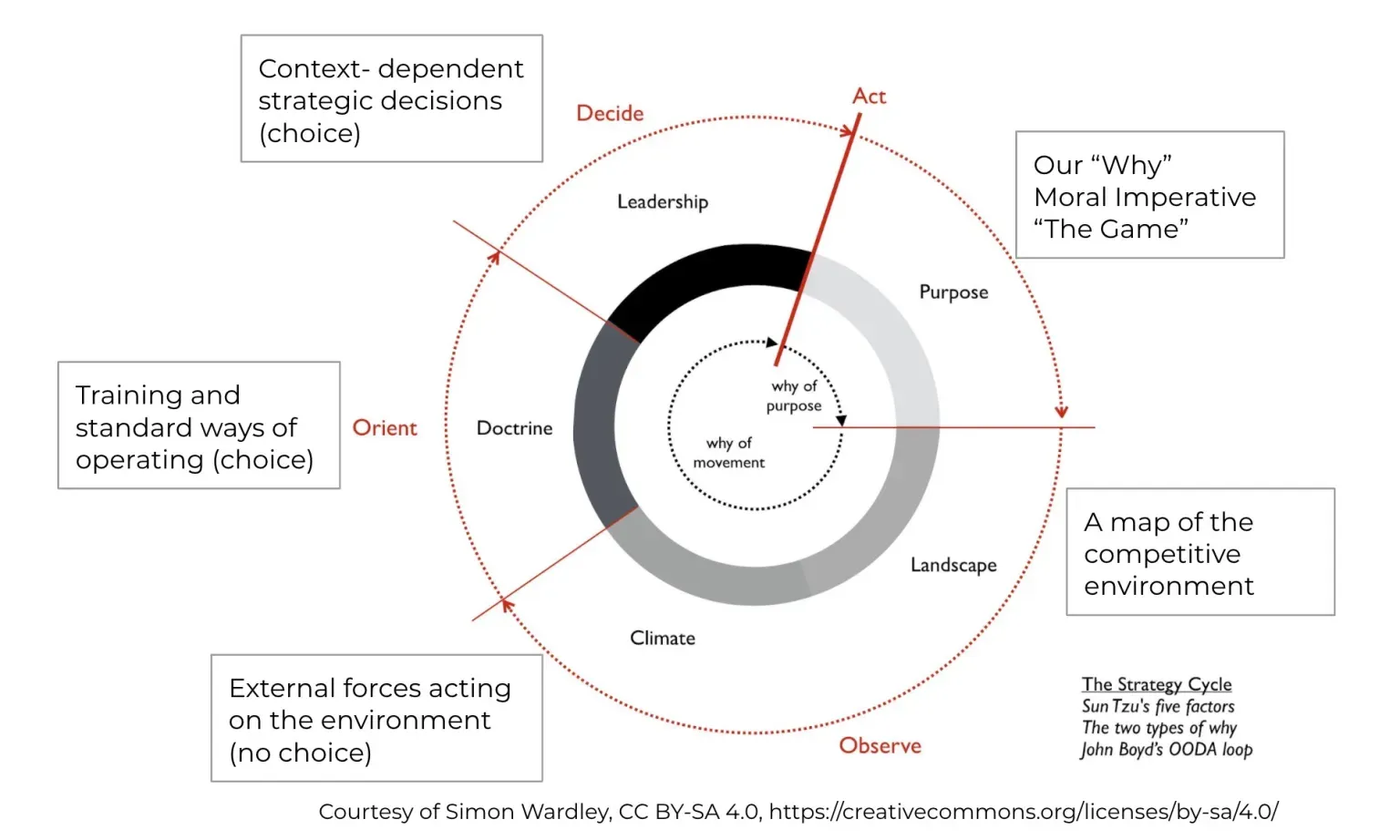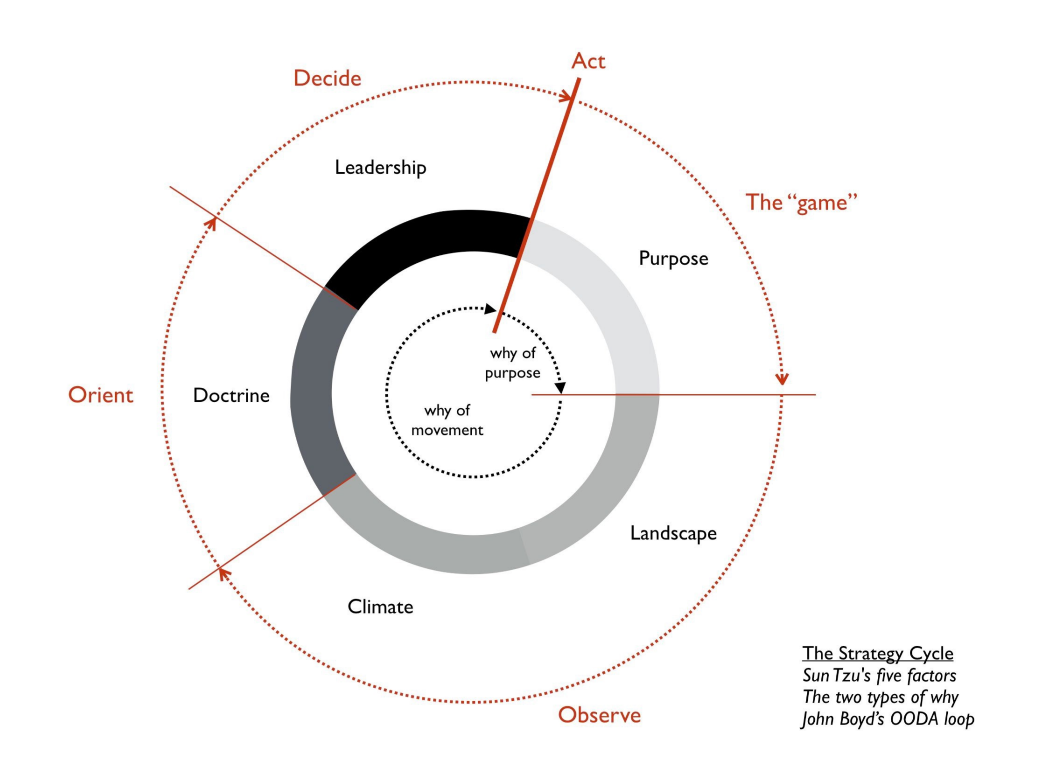 Strategy is cyclical, adaptive, and ongoing. Wardley's strategy cycle is a combination of John Boyd's OODA loop (Observe, Orient, Decide, and Act) and the five factors of strategy from Sun Tzu's The Art of War (Purpose, Landscape, Climate, Doctrine, and Leadership.)